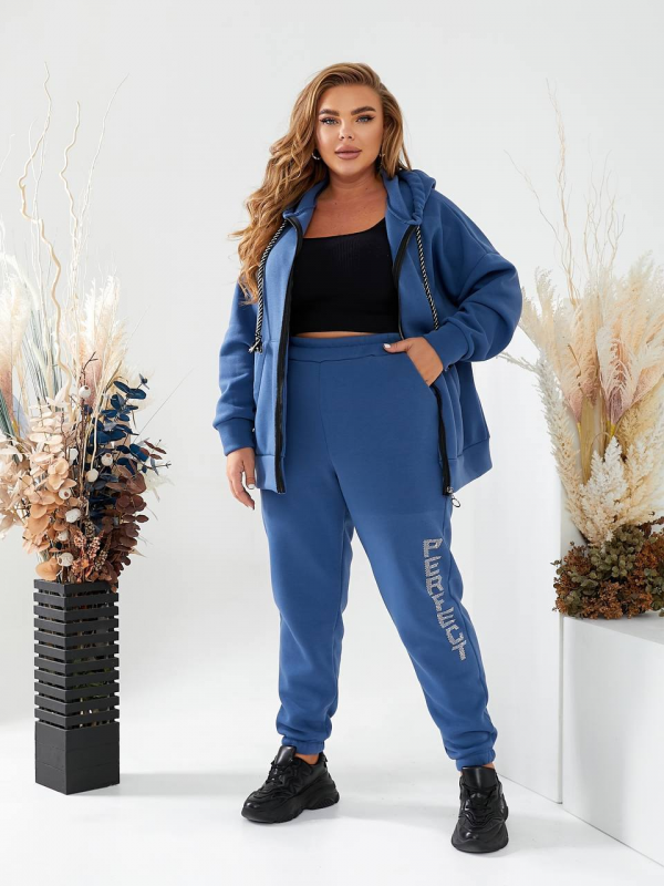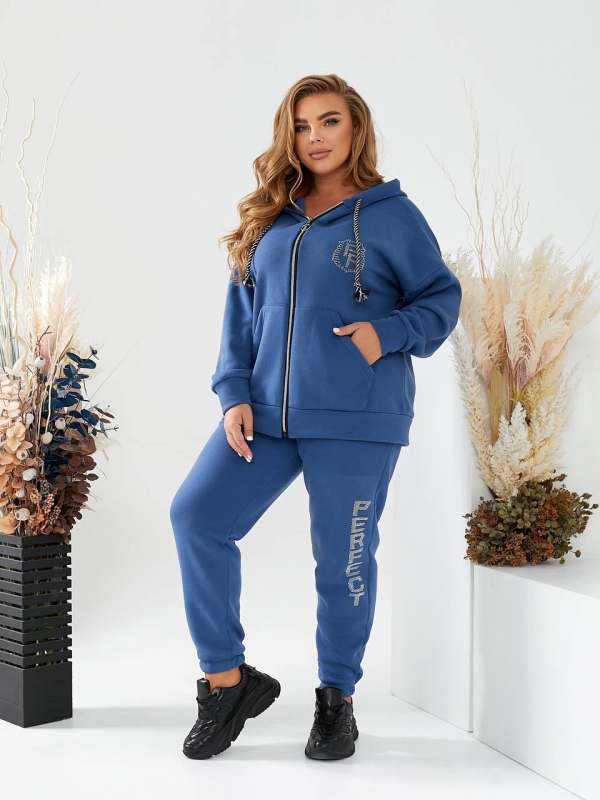 Симпатичный костюм для дома, отдыха и спорта выполнен из однотонного  трикотажного полотна. Трикотаж эластичный, к телу приятный, средней плотности на флисовой основе. Костюм состоит из толстовки и брюк.