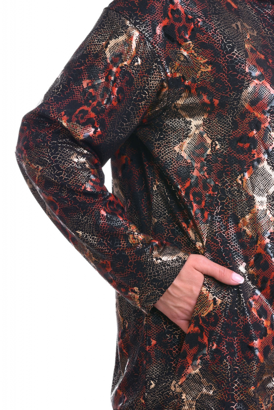 Стильная куртка из ткани с «природным» блестящим принтом-глиттером. Модель прямого кроя, с V-образным вырезом и капюшоном-воротником на завязках, с длинными рукавами со спущенной проймой, на застежке-молнии. Ветровка на подкладке, низ изделия затягивается на кулиску. Согреть руки можно в боковых карманах, расположенных в боковых швах. В такой куртке будет комфортно в прохладную ветреную погоду. Сочетание роскоши и лаконичности делают модель уместной в любых ситуациях. Подклад куртки черный.