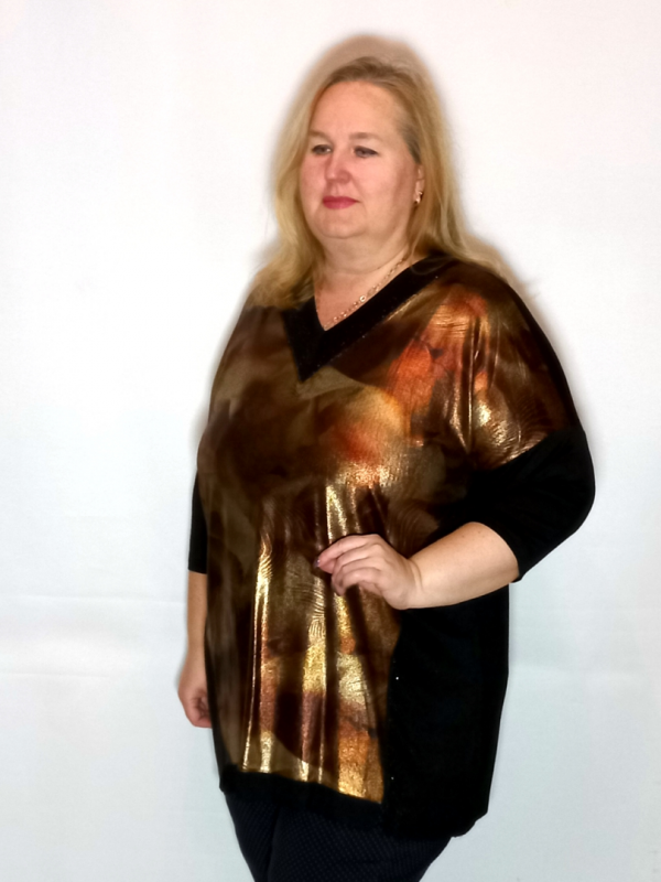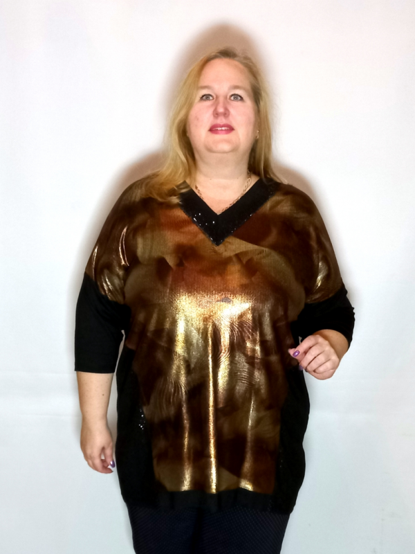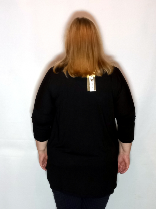 Полочка сложнокроенная: боковые вставки черного цвета, декорированы черными термостразами. Средняя часть полочки из принтованного трикотажа.