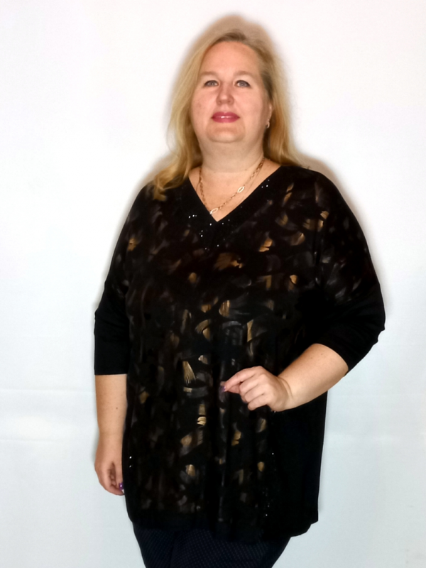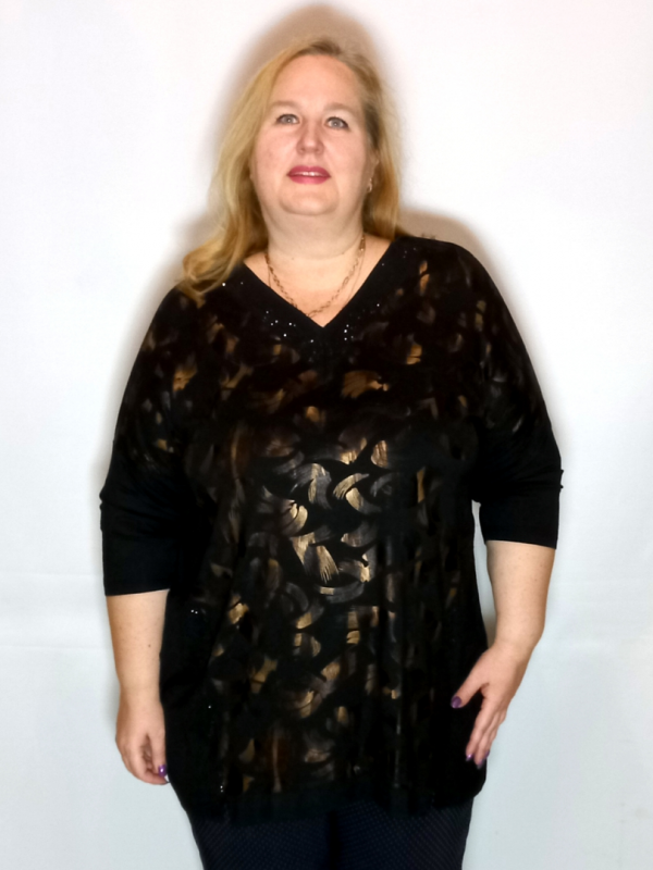 Полочка сложнокроенная: боковые вставки черного цвета, декорированы черными термостразами. Средняя часть полочки из принтованного трикотажа.