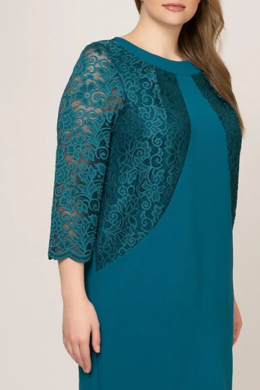 Эффектное платье, выполненное в комбинации плотного трикотажа и ажурного гипюра. Модель длиной до колен, чуть заужена книзу. С круглым вырезом горловины. Крой и игра фактур имитируют кружевное болеро с втачным рукавом 3/4.