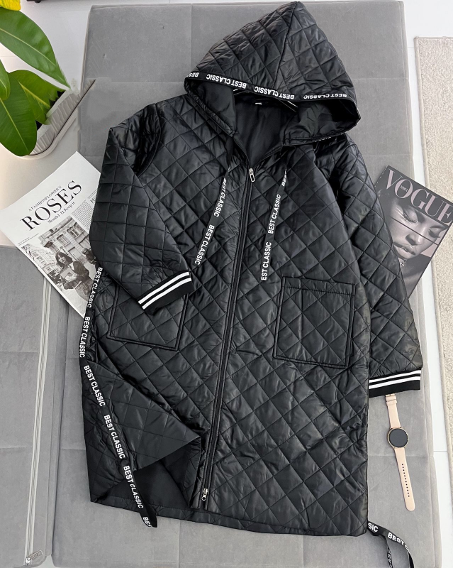 Стильная, удлиненная демисезонная куртка выполнена из курточной стежки. Слежка шуршит,  утеплитель синтепон.
