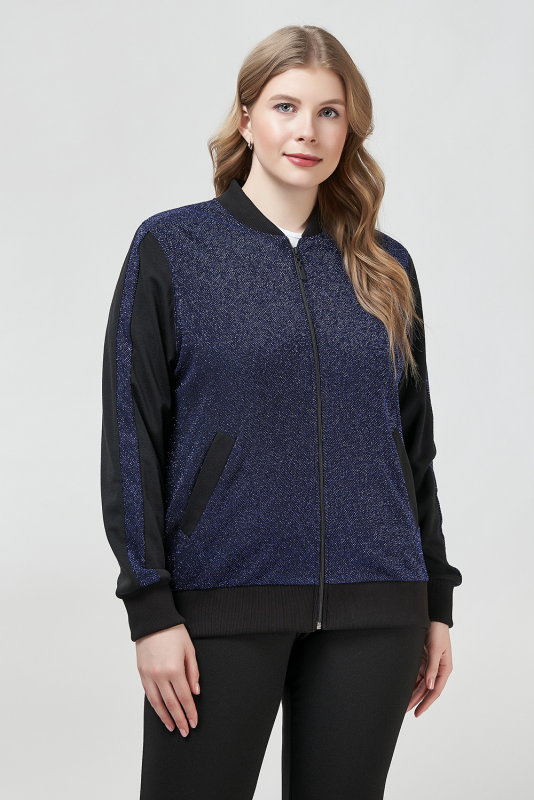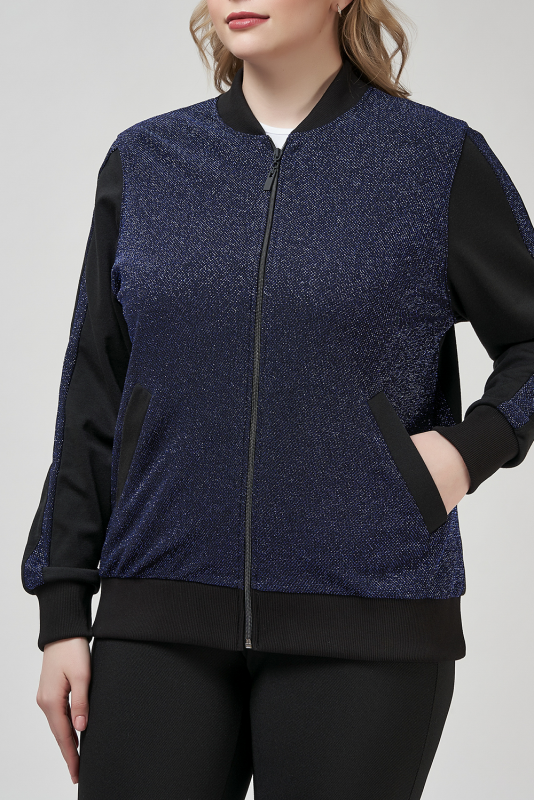 Модная ветровка бомбер, выполненная в стиле «спортивный шик», в комбинации блестящего и матового трикотажа, с длинными втачными рукавами на манжетах и с блестящими лампасами, застежке-молнии, воротником-полустойкой, косыми прорезными карманами с листочкой.